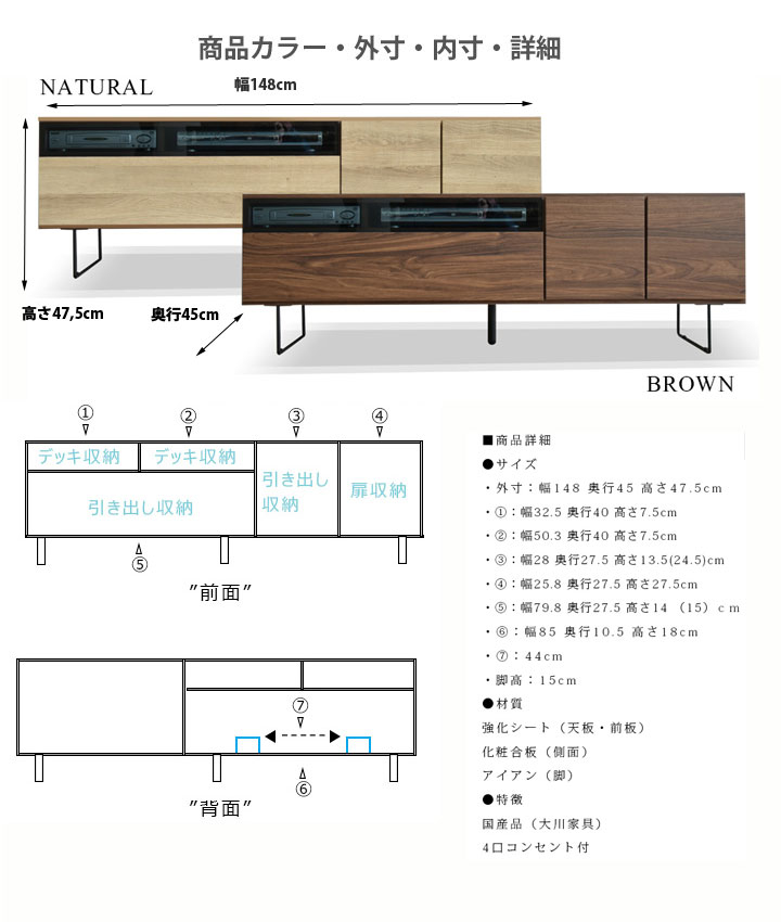 商品説明 シリーズ シンプル・モダンなリビングボード キャビネット サイズ[本体] 幅:148cm × 奥行き:45cm × 高さ:47,5(脚15cm)cm 材質MDF強化シート(天板・前板)化粧合板(側面)鉄製脚(ブラック/黒)4口コンセント付き 店長のおすすめポイントリビングルーム・寝室・書斎などあらゆるお部屋にマッチする木目調テレビボードシンプルデザイン設計 ローボード キャビネットテレビ台・パソコン台・サイドボードとしてもOK! 組み立て完成品・組み立て済み(一部、脚部の取り付けが必要な場合あり) 製造国国産・日本製(大川家具) 仕様MDF 合板ともに F★