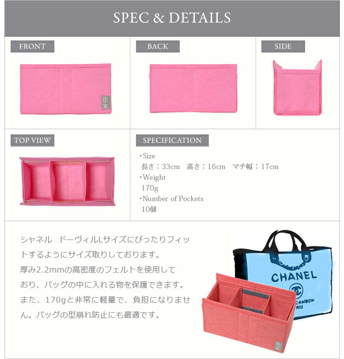 バッグインバッグ レディース 14色展開 フェルト素材 シャネル・CHANEL ドーヴィルLサイズ用 インナーバッグ 整理 トートバッグ 小さめ 大きめ a4 かわいい 軽量 軽い【発送まで3週間】