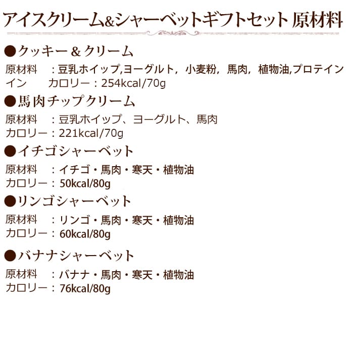 馬肉チップクリーム(1個) クッキー&クリーム(1個) イチゴシャーベット(2個) バナナシャーベット(1個) リンゴシャーベット(1個) ■スペック 6個セット商品 手作り商品 砂糖、添加物不使用 ■保存方法・賞味期限 お届け後、冷凍保存で3ヶ月 こちらの商品は冷凍クール便でのお届けです。