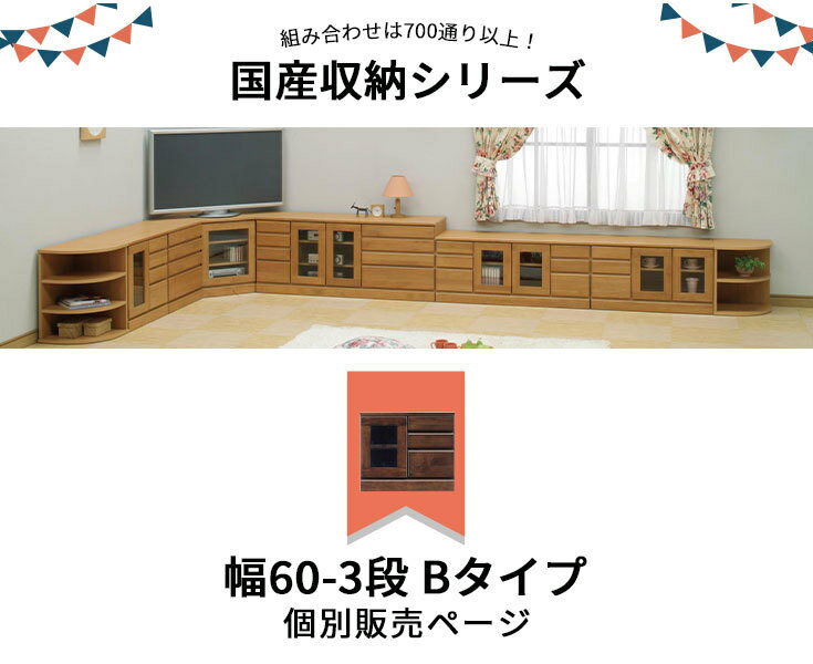 組み合わせ収納:幅60-3段用ローボードBタイプ 【サイズ】幅59.8cm×奥行き43cm×高さ50cm 【内 寸】左ガラス扉:幅24cm×奥行38.5cm×高さ35cm 右小引出:幅23cm×奥行33.5cm×高さ6cm 右大引出:幅23cm×奥行33.5cm×高さ13.5cm 【材 質】アルダー材、MDF、ウレタン塗装 【仕 様】可動棚1枚(奥行29cm):6cmピッチ3段階 背面コーダー穴有、天板耐荷重約60kg 【カラー】ホワイト、ナチュラル、ブラウン、ダークブラウン 【備 考】国産品、完成品 【送 料】送料無料(※北海道・沖縄・東北・離島等の一部地域を除く) 【商品紹介】4色から選べる収納シリーズ 1人暮らしのお部屋から広々リビングまで組み合わせ次第で満足できる収納が見つかります。