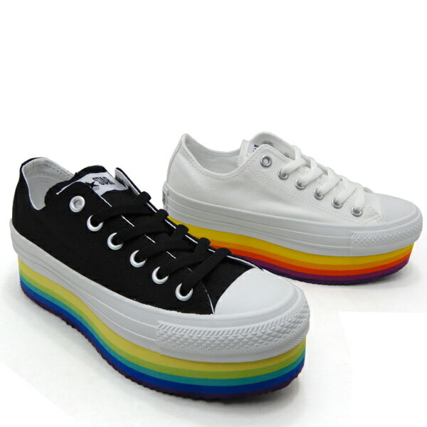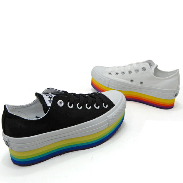 厚底ソールにはレインボーをモチーフにしたグラデーションがとっても可愛く、 ホワイトには暖色系のグラデーション、 ブラックには寒色系のグラデーションを組み合わせたおしゃれなコンバースですよ。