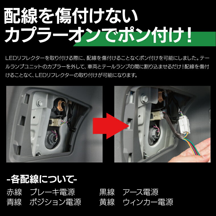 テールランプユニットのカプラーを外して、車両とテールランプの間に割り込ませるだけ! 配線を傷付けることなく、LEDリフレクターの取り付けが可能になります。