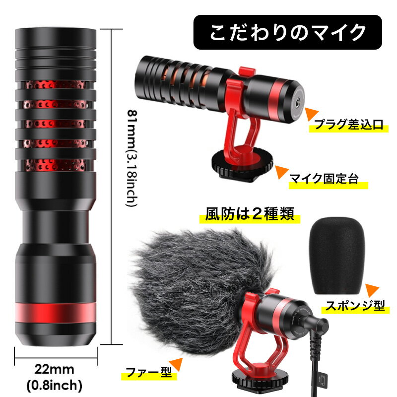 ■商品説明 スマホ用マイク 三脚付き 細部までこだわり抜かれたセット ブラックボディにレッドカラーがアクセント。